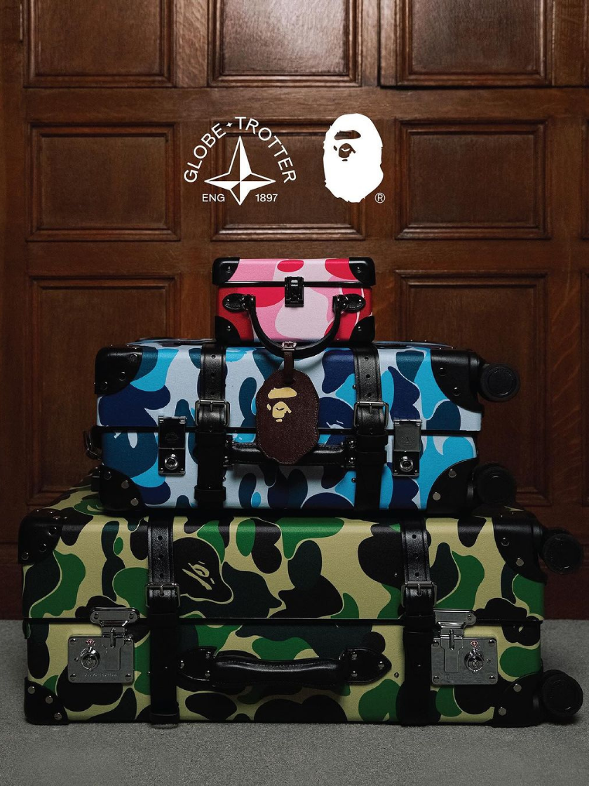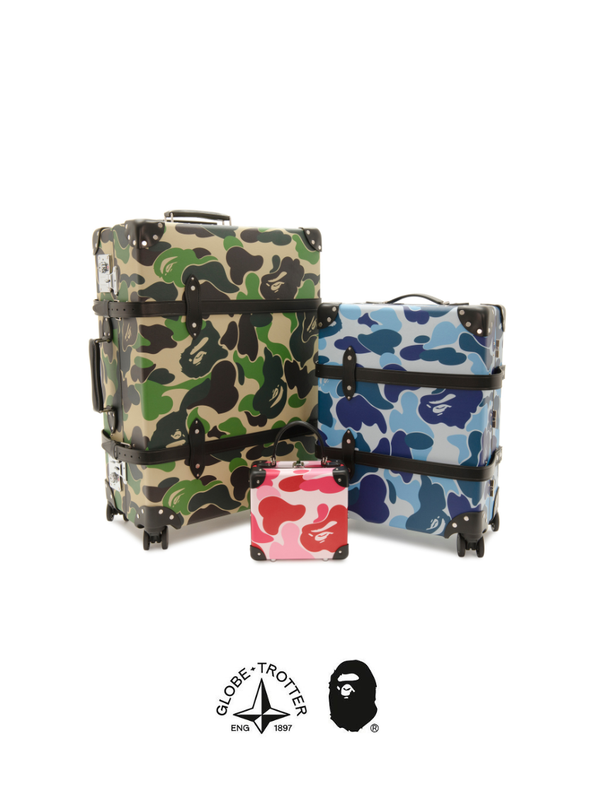 The inaugural collaboration, which launched in April 2024, is a three-piece collection incorporating BAPE®’s signature ABC Camo print on Globe-Trotter’s iconic Vulcanised Fibreboard body, available in a London Square handbag, Carry-On suitcase, and Large Check-In case. Each one comes with an exclusive luggage tag bearing the famous Ape Head logo.