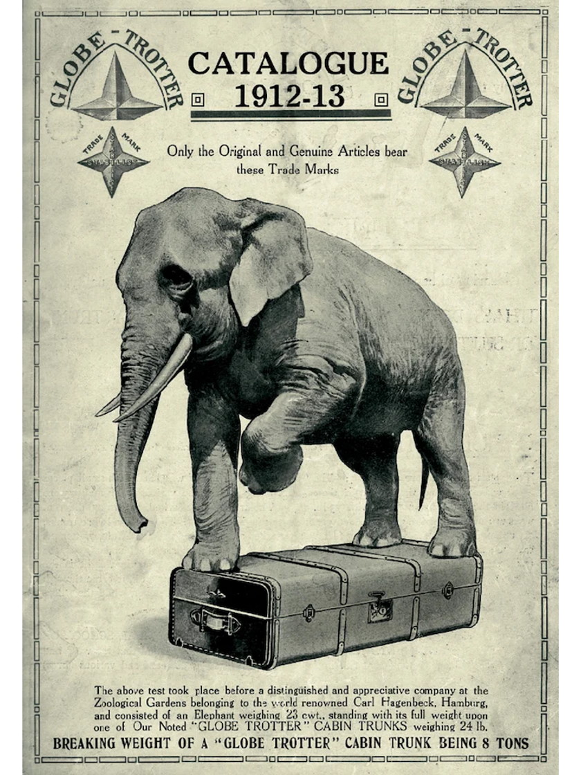 Vulcanised fibreboard was invented in 1859 by Englishman Thomas Taylor. Formed of paper, cotton and wood pulp, layers of the fibreboard could be specially bonded together (or "vulcanised"), saturated in a special solution, then compressed to the desired thickness. Noting the new material was extremely resilient, lighter than aluminium and tougher than leather, Globe-Trotter shrewdly patented the use of vulcan fibre in its cases in 1902, and in a stroke elevated its artisan offering over leather-bound competitors. Indeed, a notable Globe-Trotter advert in its 1912-13 catalogue depicted an elephant from the Hagenbeck Zoo in Hamburg standing on a cabin trunk to prove the claim that its breaking weight was a mighty eight tons.
