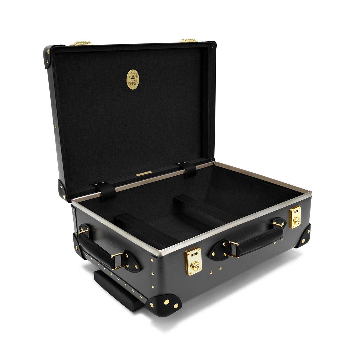 Made from Globe-Trotter’s signature vulcanised fibreboard, renowned for its durability and lightweight construction, the charcoal grey exterior is complemented by handcrafted black leather corners, creating a sleek and cohesive design. Brass fittings add a touch of elegance, offering a warm contrast to the cool charcoal tones and elevating the overall look.