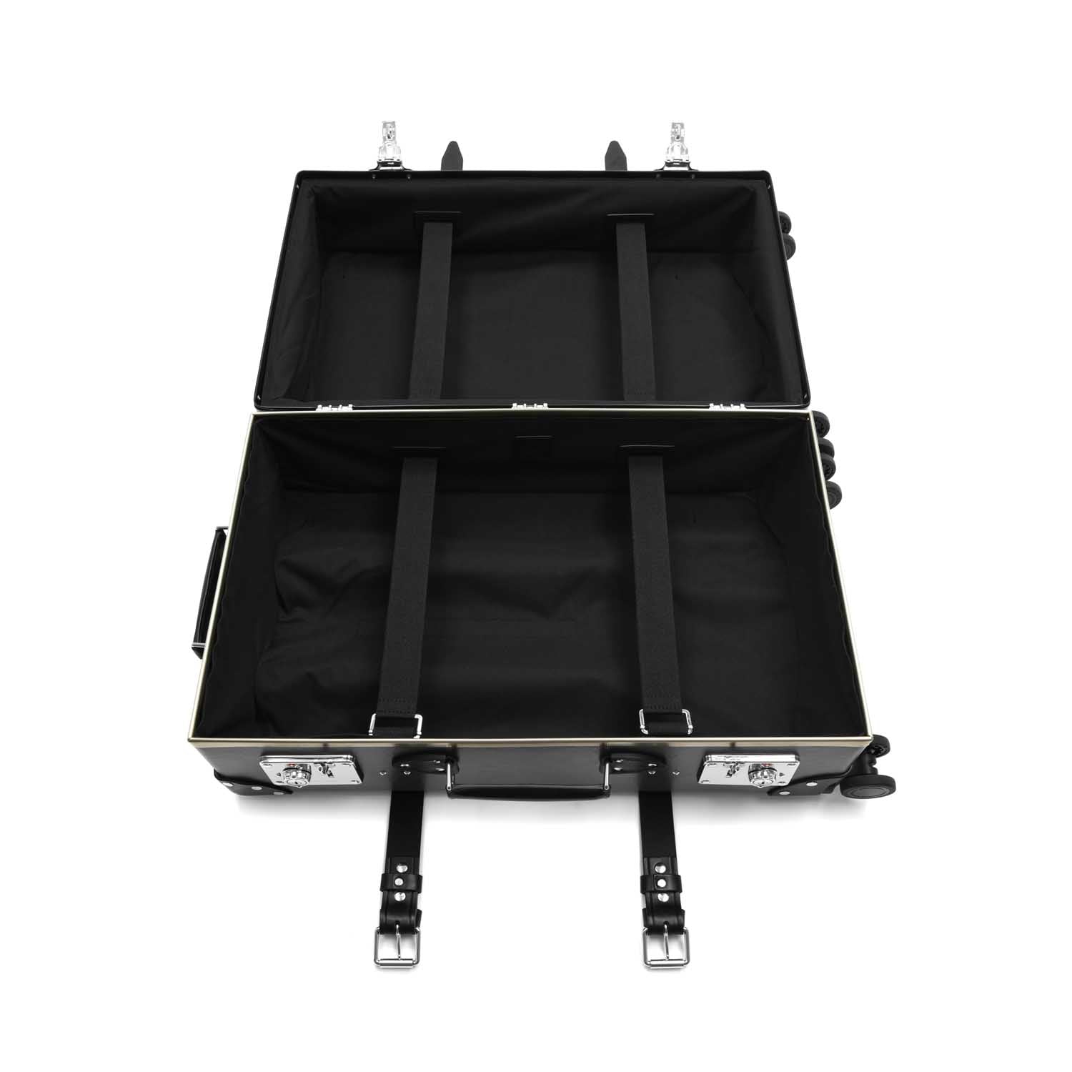 Part of the Centenary Charcoal collection, this case features a deep charcoal vulcanised fibreboard exterior, contrasted with meticulously handcrafted black leather corners, straps, guides, and a leather-wrapped trolley handle. Polished chrome fittings provide a sleek contrast, enhancing the case with a refined, contemporary touch.