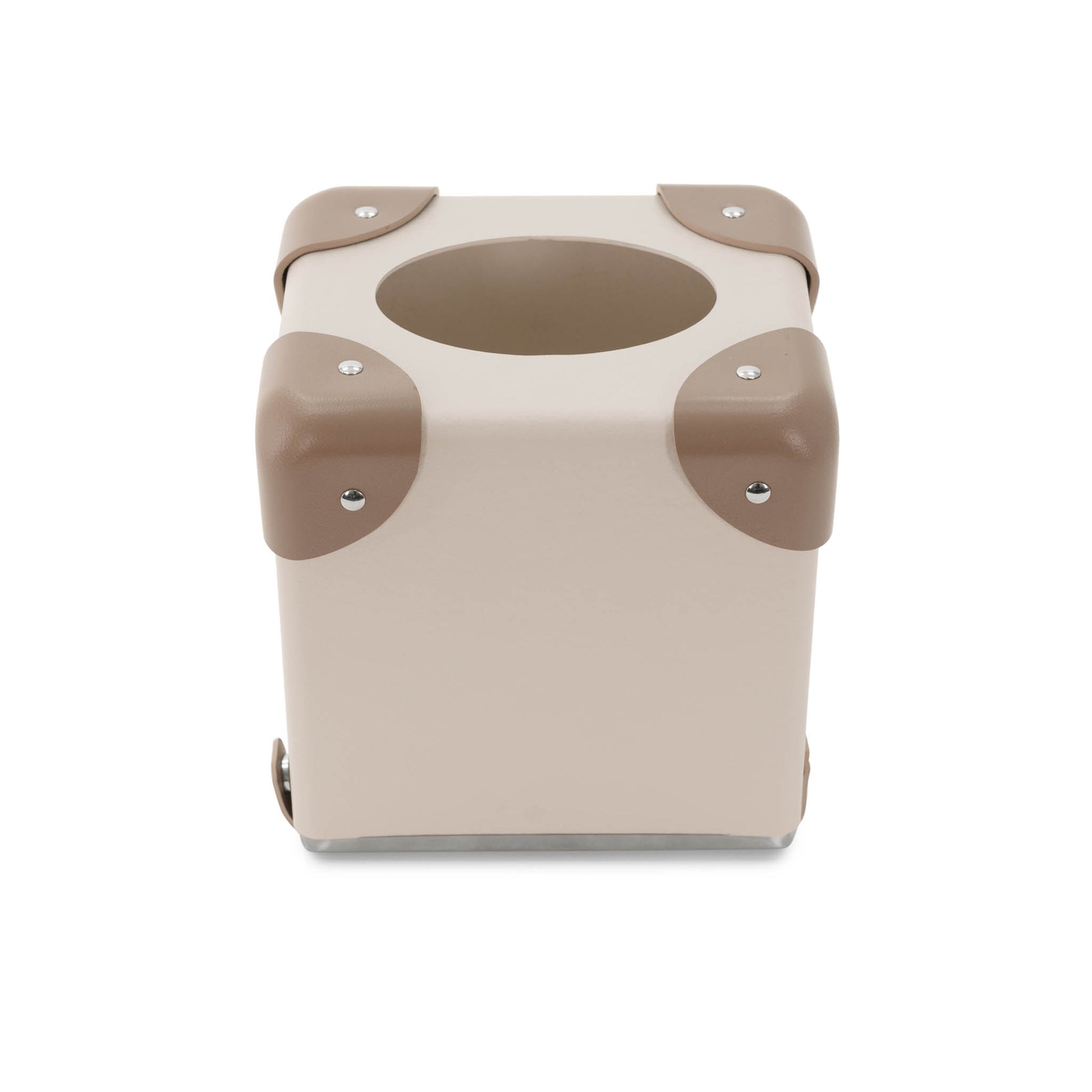 Made from vulcanised fibreboard finished in Chalk and accented with vegetable-tanned leather corners in Moss, the piece is assembled with polished nickel fittings that highlight its architectural precision. The proportions are carefully tailored to fit a standard square tissue box, offering seamless integration into both contemporary and traditional interiors.