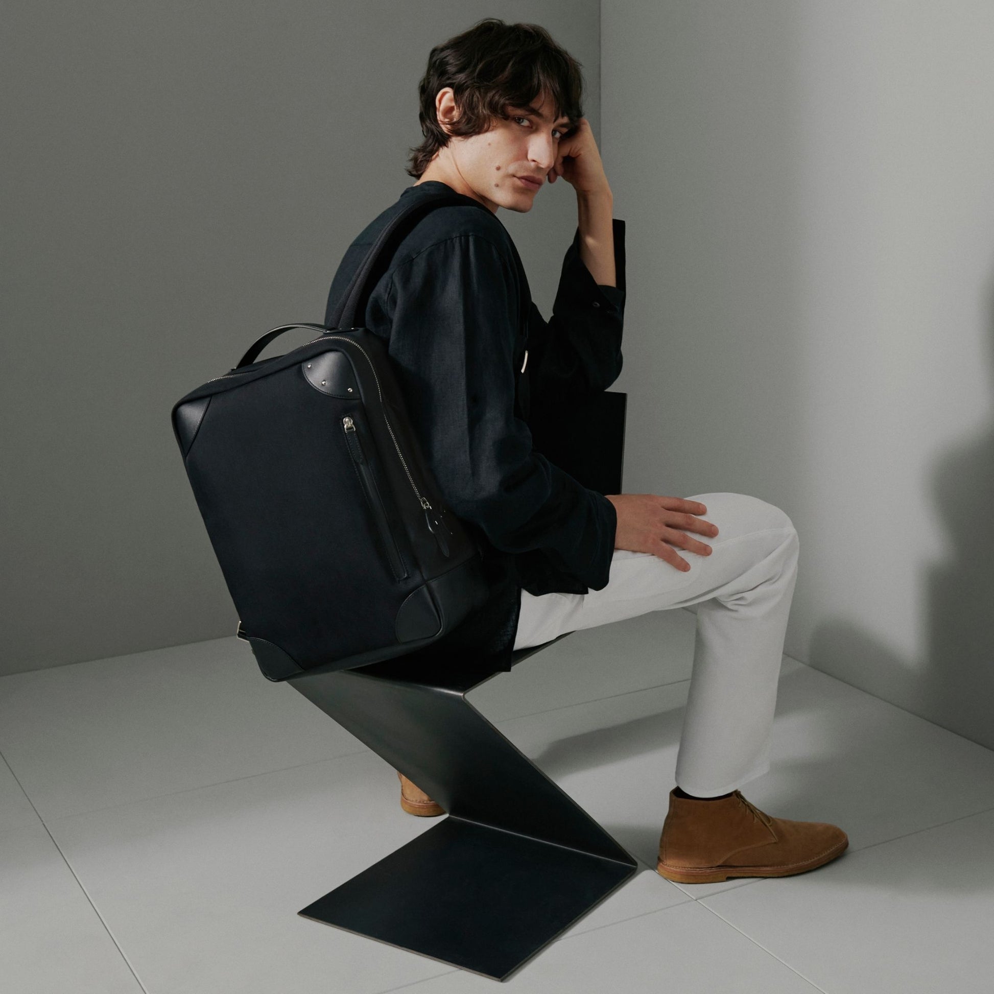The Metropolis Backpack in Black reinterprets a classic silhouette through the lens of Globe-Trotter craftsmanship. Handcrafted in Tuscany from smooth Italian leather and densely woven canvas, it balances durability with elegance, designed for both the city commute and journeys further afield.