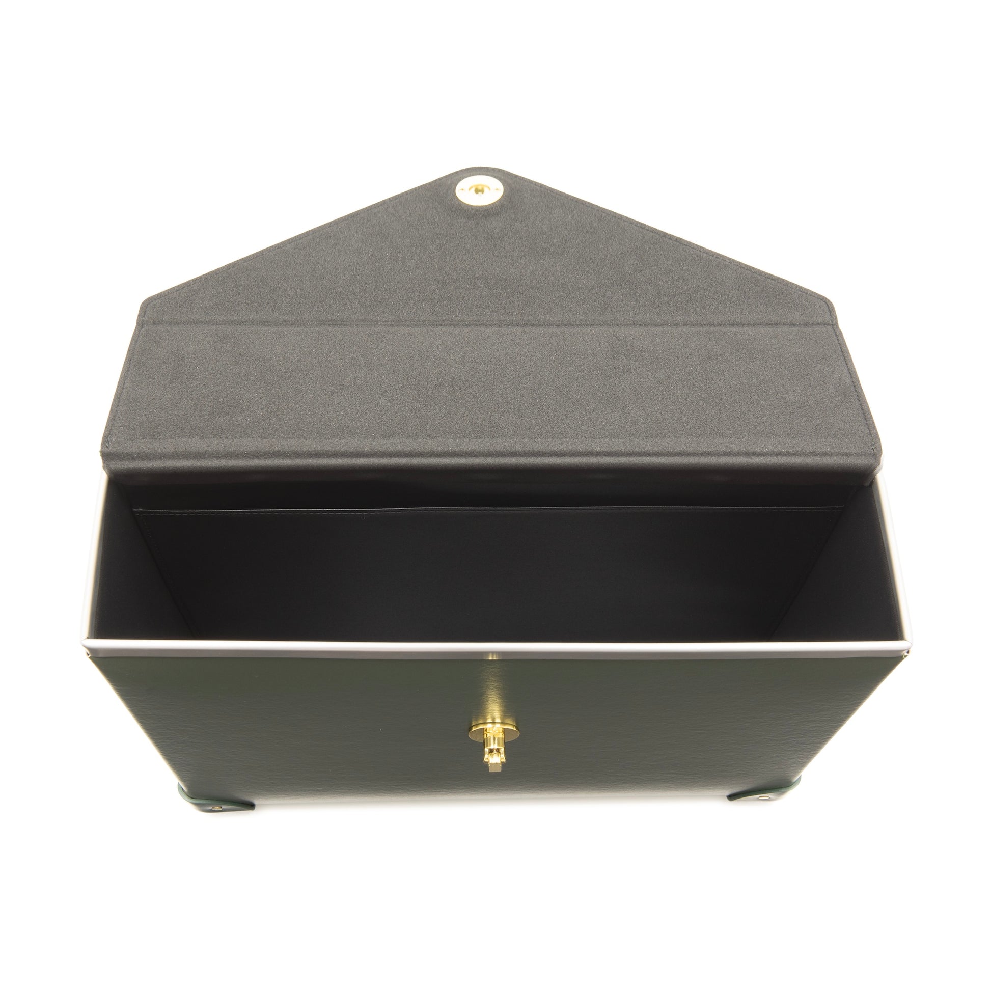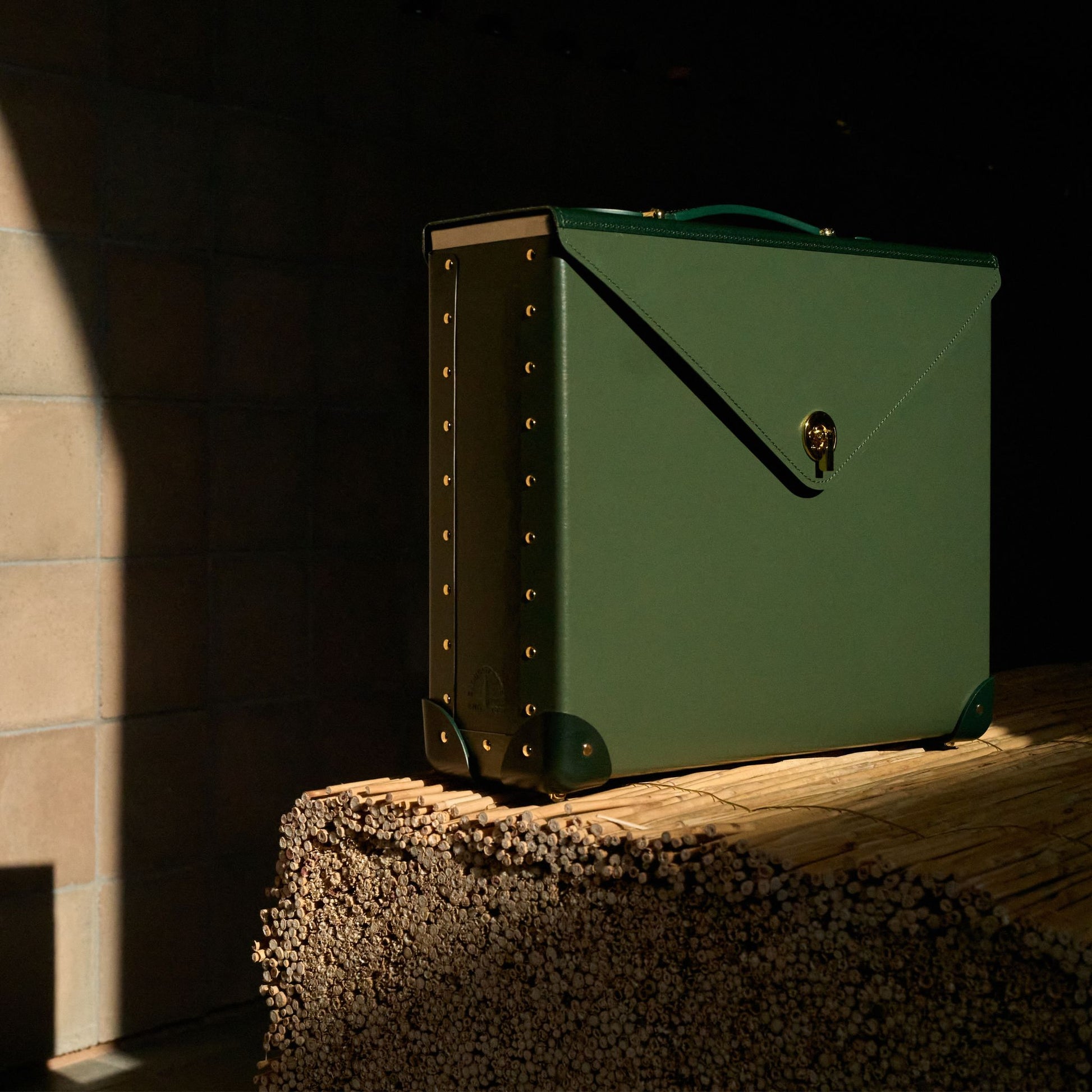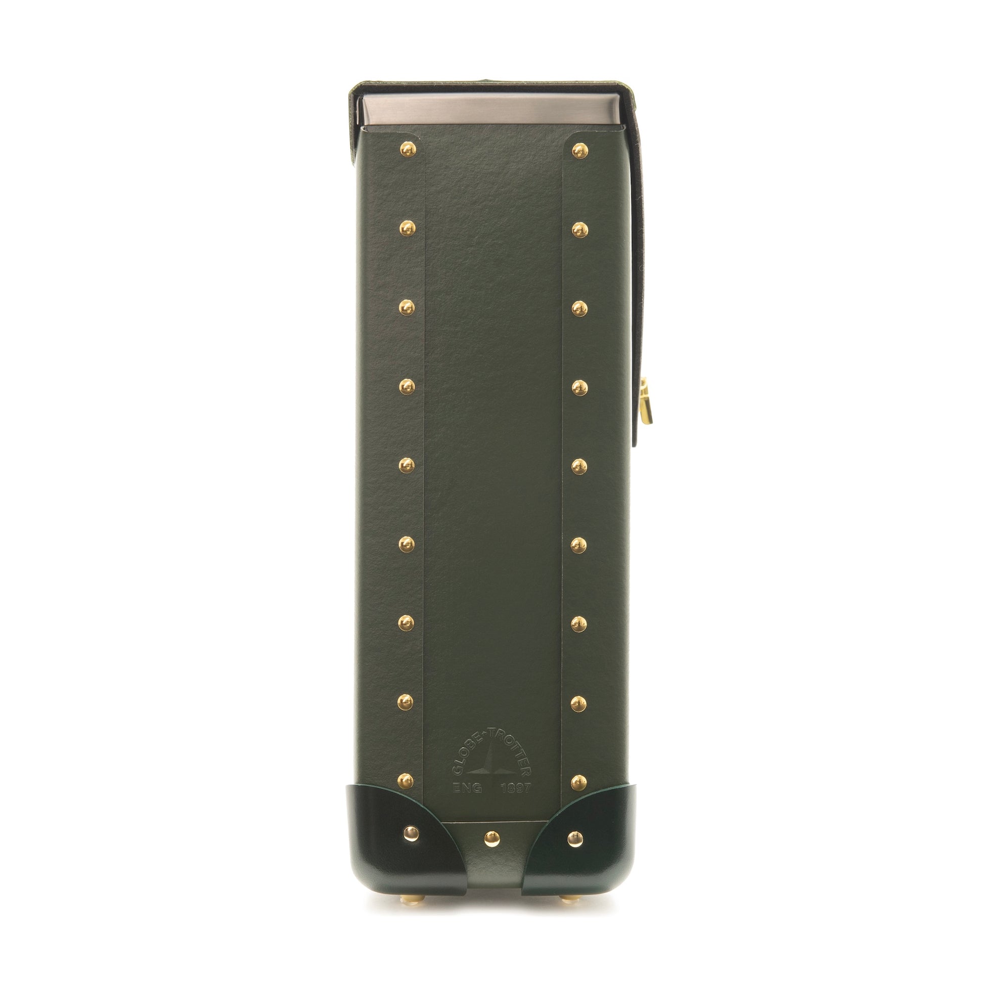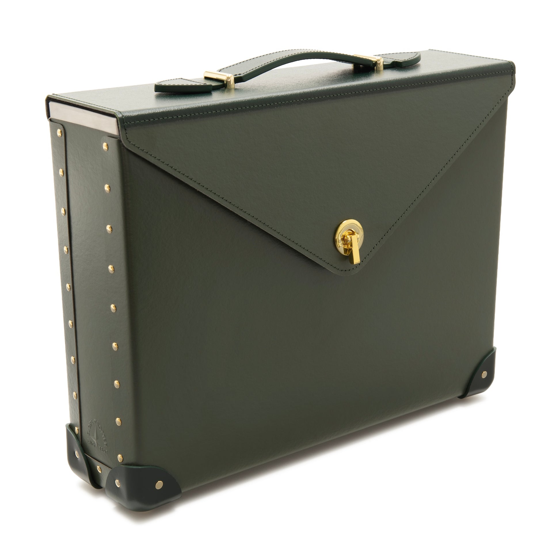 Its structured silhouette is finished with Kerry Green leather corners, a matching flat handle, and polished brass rivets, echoing the signature details of the Original Collection. Protective foot studs provide stability when set down.